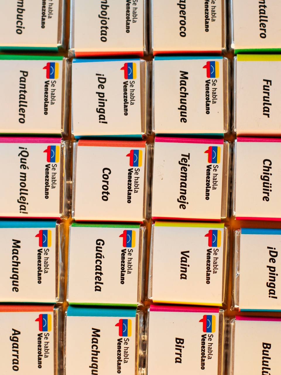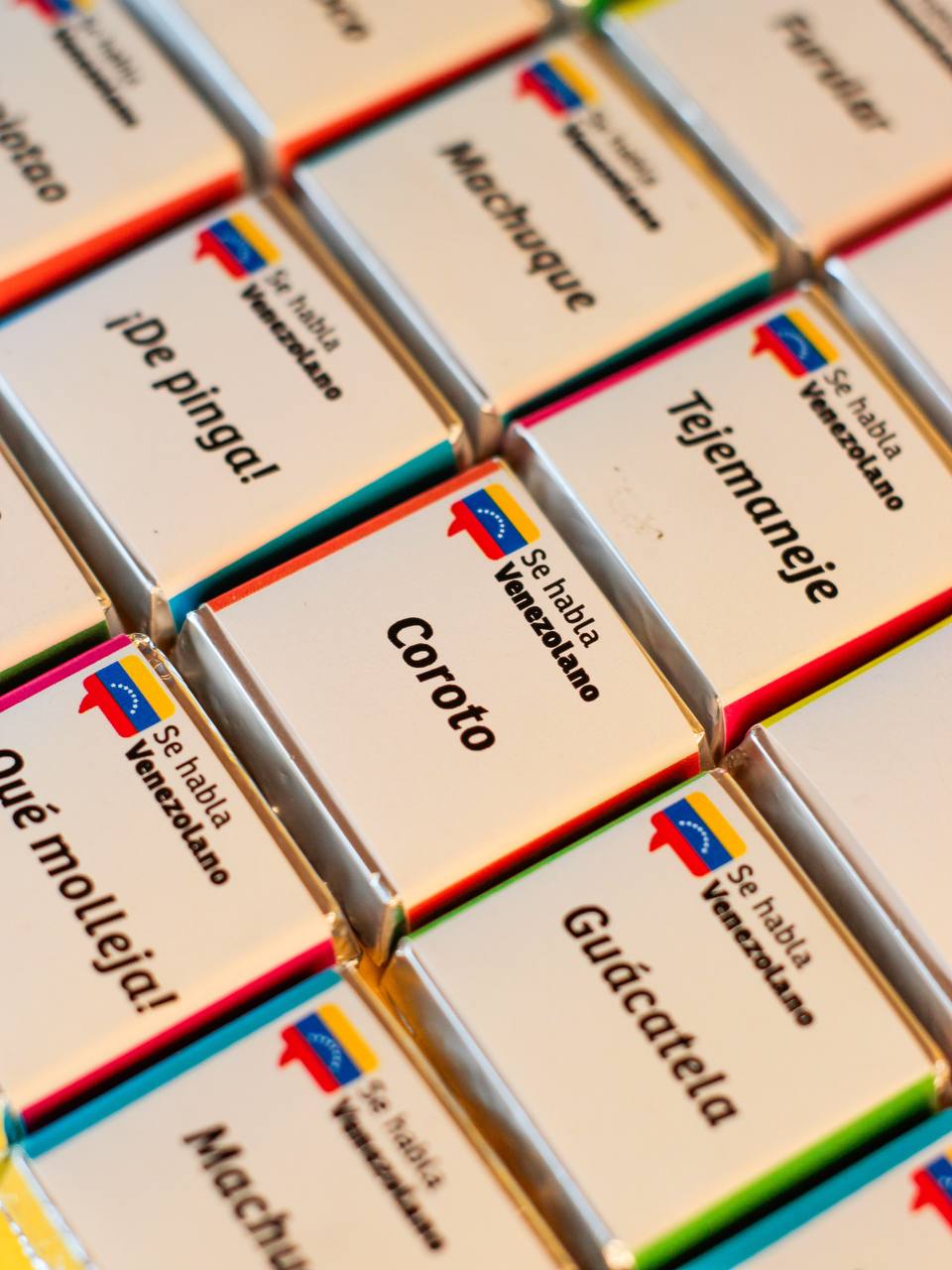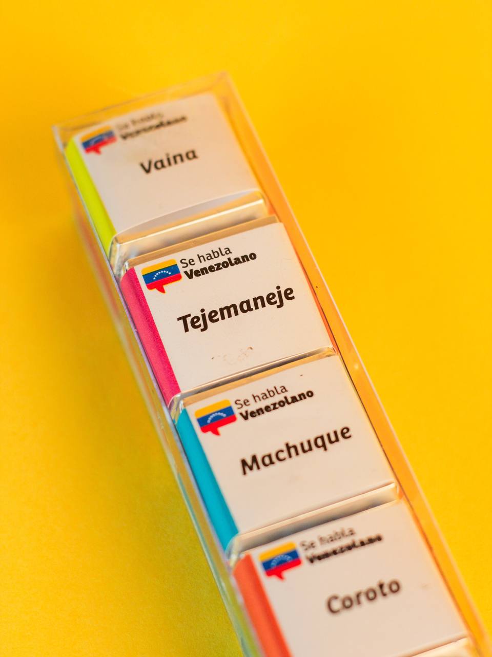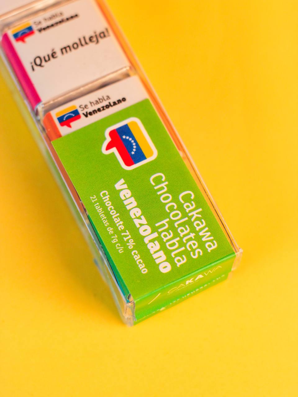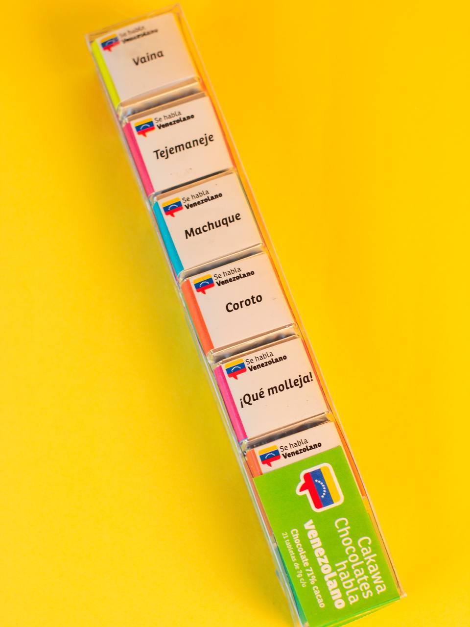 Es un pack de 21 tabletas de 7 gramos de chocolate oscuro cada una con etiqueta que señalan palabras del habla venezolano.