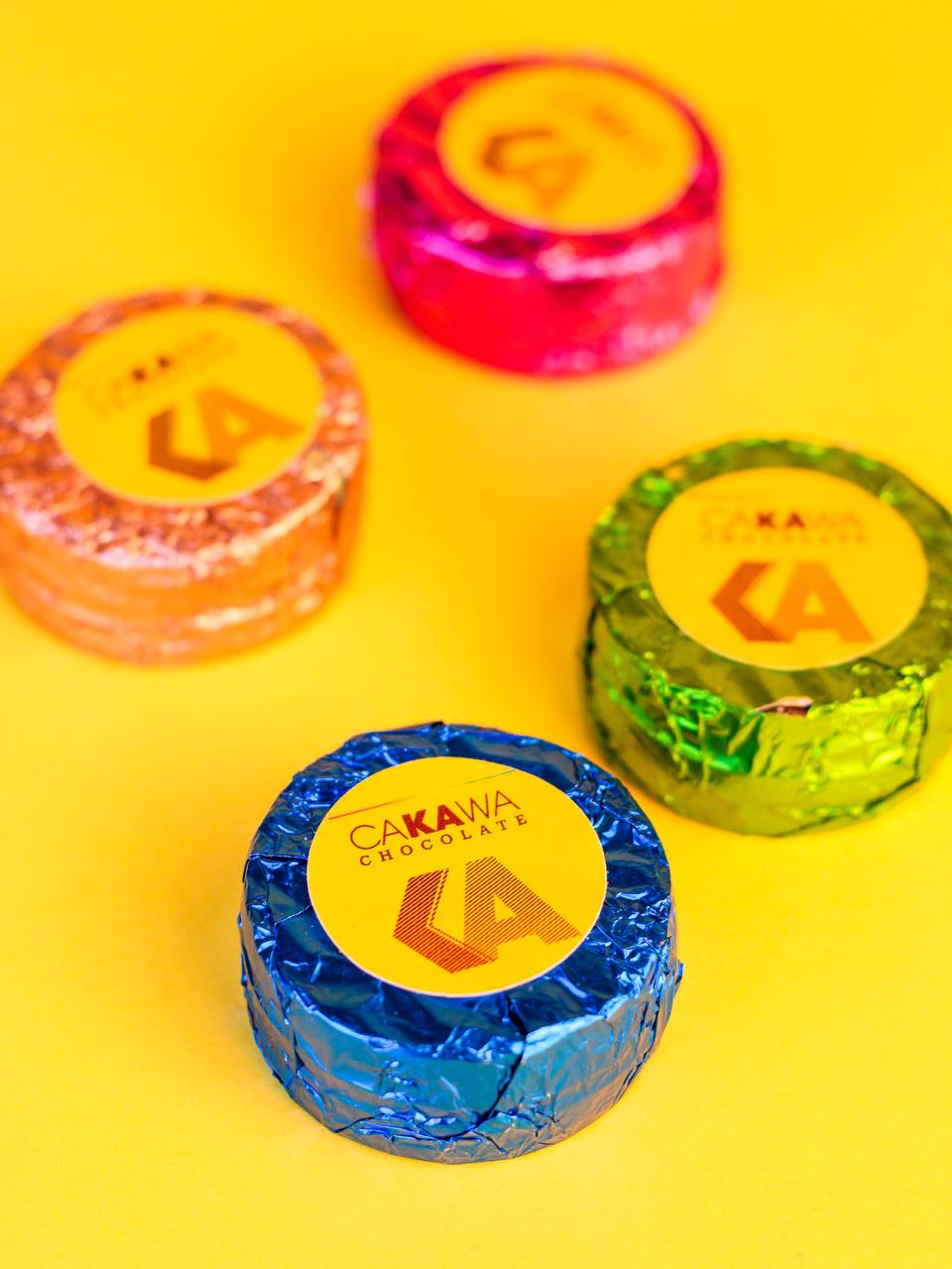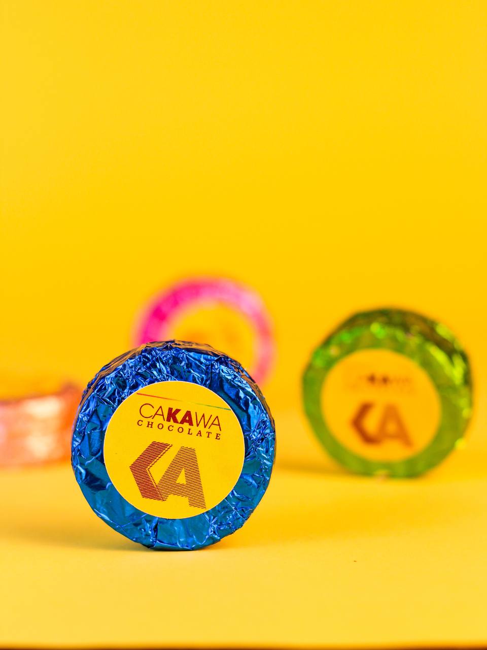 Empaque de 30gr. de monedas de chocolate oscuro con sal marina